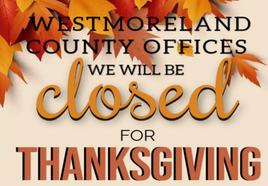 By admin on Nov 25, 2025 print Westmoreland County Offices will be closed for Thanksgiving:Noon Wednesday, November 26thThursday, November 27thFriday, November 28th Attachments Thanksgiving Closure Schedule Flyer Read more articles Previous Public Notice - Board of Supervisors Public Hearing - Proposed Capital Improvement Plan 2026-2030 Public Notice News Public Notice hero post admin Nov 25, 2025 1min read A- A+ print